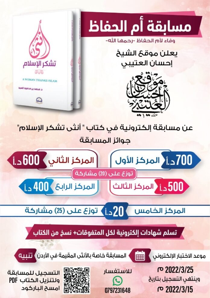 وفاء لأم الحفاظ -رحمها الله- يعلن موقع الشيخ إحسان العتيبي عن مسابقة إلكترونية، في كتاب