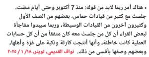 “هناك أمر ربما لابد من قوله: منذ ٧ أكتوبر وحتى أيام مضت، جلستُ مع كثيرٍ من قيادات حماس، بعضهم من الصف الأول وكثيرون آخرون من القيادات الوسيطة، وربما سيبدو مفاجأة لبعض القراء أن كل من جلستُ معه كان متفقاً من أن كل حسابات العملية كانت خاطئة، وأنها أنتجت (كارثة) ونكبة على غزة وأهلها، وبعضهم (وصفها بأقسى من ذلك).