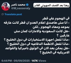 من المضحك المبكي أن ترى ما يُسمى بـ “القطيع الإيراني” يملأ الدنيا صخبًا وسخرية من صمت النظام السوري على قصف العدو الصهيوني لدمشق وحمص وحلب، ويزاودون بأن الحكومة الجديدة لم تطلق رصاصة واحدة في وجه الطائرات المعتدية! لكن السؤال السهل اليسير: هل يجرؤ هؤلاء على أن يوجّهوا الكلام ذاته إلى قطر؟ هل يستطيعون أن يقولوا: “يا قطر، لماذا لم تردي على قصف الاحتلال لأراضيك”؟ أم أن الريالات حين تُسكب على الطاولة تُخرس الحناجر وتُعقم الأقلام، فيصبح الصمت فجأة حكمة، والسكوت سياسة، والذل “مصلحة وطنية”؟