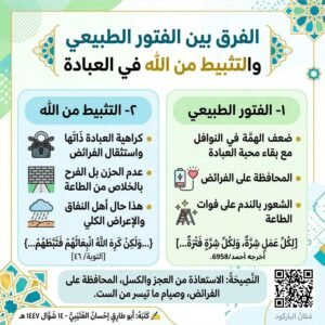 ١. الفتور الطبيعي: هو ضعف الهمة والنشاط في النوافل مع بقاء محبة العبادة في القلب، والمحافظة على الفرائض، والشعور بالندم أو الحزن على تفويت الطاعة. وهذا حال يعتري كل إنسان، لقول النبي صلى الله عليه وسلم: “لِكُلِّ عَمَلٍ شِرَّةٌ، وَلِكُلِّ شِرَّةٍ فَتْرَةٌ، فَمَنْ كَانَتْ فَتْرَتُهُ إِلَى سُنَّتِي فَقَدْ أَفْلَحَ، وَمَنْ كَانَتْ إِلَى غَيْرِ ذَلِكَ فَقَدْ هَلَكَ” رواه الإمام أحمد وصححه الألباني.