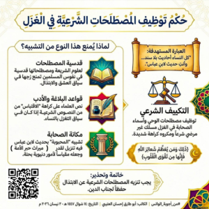 ثَانِيًا: علماء الشريعة المختصون بالبلاغة والأدب قسموا “الاقتباس” من النصوص والمصطلحات الشرعية إلى أقسام، ونصوا على أن توظيف ذلك في الغزل أو التغزل بالنساء يعد مَكْرُوهًا كَرَاهَةً شديدة، بل يرى بعضهم تحريمه؛ لما فيه من الابتذال وسوء الأدب مع ما يتعلق بجناب الوحي ومصادره.
