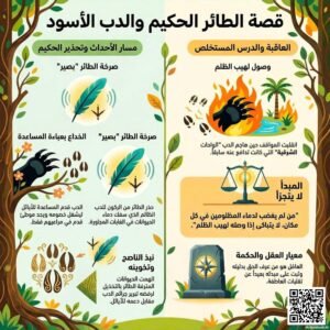 وكان في الغابة طائر حر حكيم يقال له “بصير”، يرى ما وراء الأكمة، فقام ناصحا ومحذرا، وصاح بأعلى صوته: يا معشر الحيوان، ويا قطيع الأيائل! إن صراعكم مع الخنازير حق، ولكن الركون إلى الدب الأسود مهلكة، فكيف تمدحون من سفك دماء إخوانكم في الغابات المجاورة؟ وكيف تأمنون مكره وهو إنما يبتغي التوسع على حسابكم؟